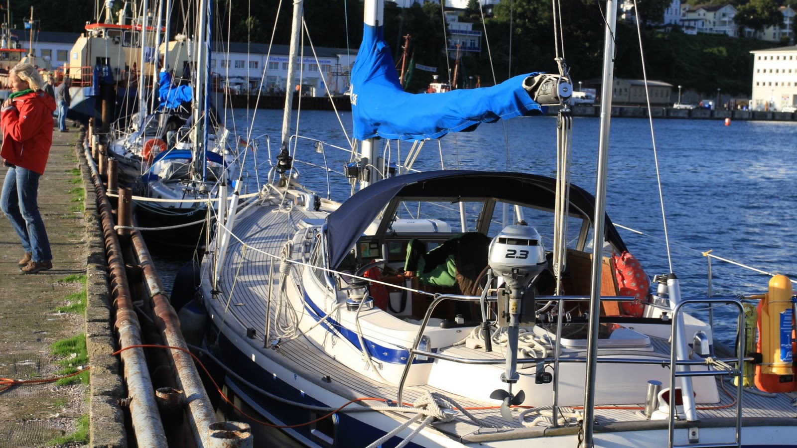 Ich bespreche alles bis ins Detail mit meiner Crew. Tobias bedient die Fock. Susanne springt mit einem Festmacher auf die Mole und versucht eine Leinenverbindung herzustellen. Tobias kommt Ihr zu Hilfe, sobald die Fock weggerollt ist.