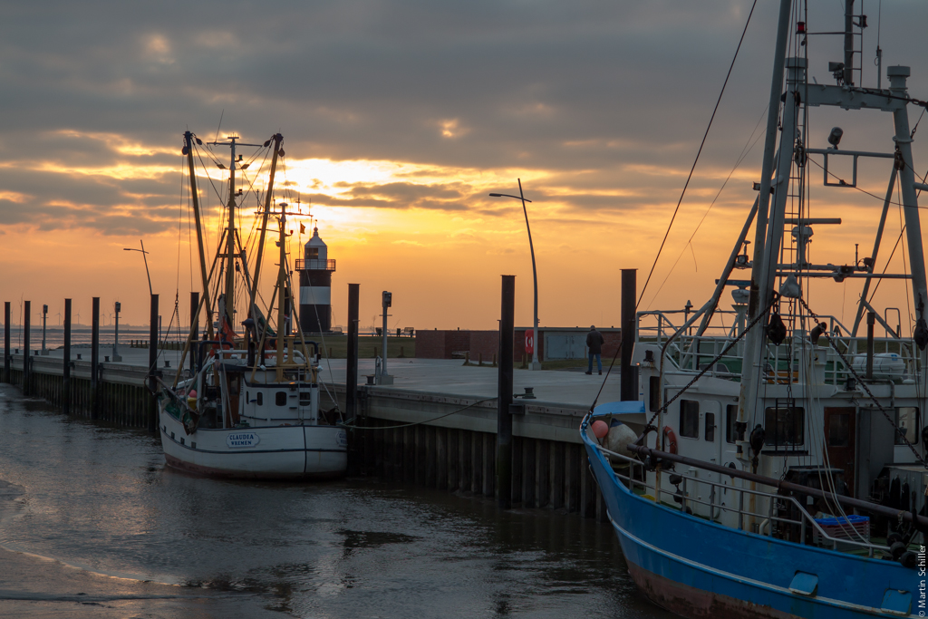| Hafen Wremen bei Niedrigwasser – Fischerboote im Schlick |