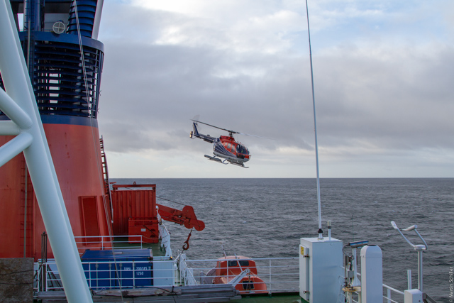 Die Polarstern liegt momentan im Berkeley Sound im Nordosten der Insel Ostfalkland. Nachdem unser Kollege mit dem Helikopter ausgeflogen wurde, kalibrieren wir noch diverse Messgeräte. Heute Abend werden wir die Fahrt fortsetzen. Unser Meteorologe vom DWD an Bord, hat Sturm aus West bis Südwest mit 9 BFT bei einer signifikanten Wellenhöhe von 7 Metern angekündigt. Das wird wohl ziemlich unkomfortabel werden.