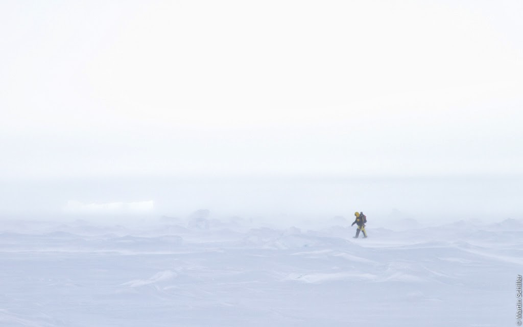 Unser zweites Ice-Camp ist bis jetzt von schlechten Sichtbedingungen durch Whiteout geprägt. Hierrunter versteht man das Verschwinden des Horizontes weil es keine Kontraste mehr gibt. Selbst das Gehen auf dem Schnee wird schwierig, da man Unebenheiten nicht sieht. Auch beim Fotografieren hat man nur ein Change, wenn die Bedingungen mal für eine halbe Stunde besser sind. Meist sind aber innerhalb kürzester Zeit die Kontraste wieder weg.