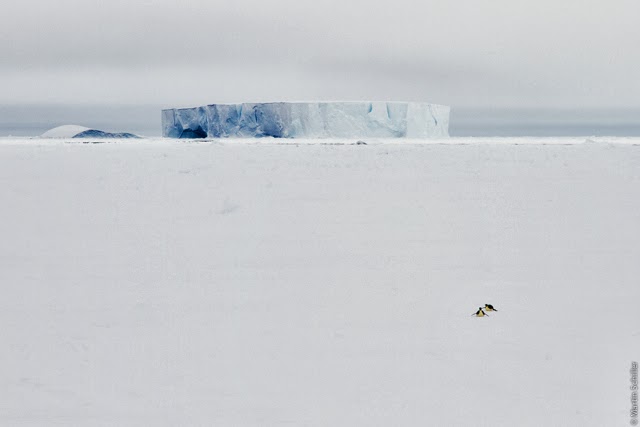 Begegnung mit einem australischen Kollegen bei leichtem Schneetreiben. Orientierung bietet nur der größere Eisberg links im Hintergrund |