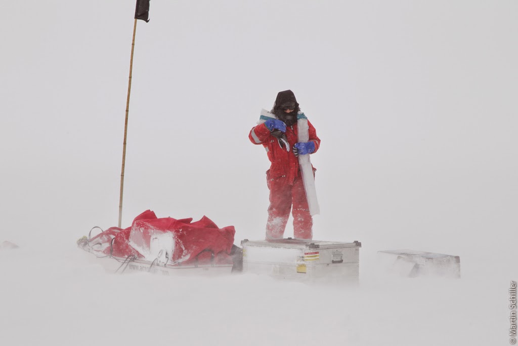 Das Wetter wurde schlechter und der Wind drehte auf Nordost. Dadurch wurde das Eis dichter und wir kamen erstmal nicht weg. Naja wir haben die Zeit genützt und mit unserem Messprogramm weiter gemacht. Ungemütlich Der ROV-Leitstand hat sich bestens bewährt. So sieht es dann aus, wenn eine tiefgefrorene Kamera wieder aufgetaut ist. Es erstaunt mich immer wieder, was diese Geräte alles klaglos ertragen. Da sitzen wir wohl im selben Boo Als die Schneetrift noch mehr zugenommen hatte Manchmal macht es auf mich den Eindruck, dass Die Kaiserpinguine die Erwachsenen und die Adeliepinguine die Kids sind Einsame Wanderer