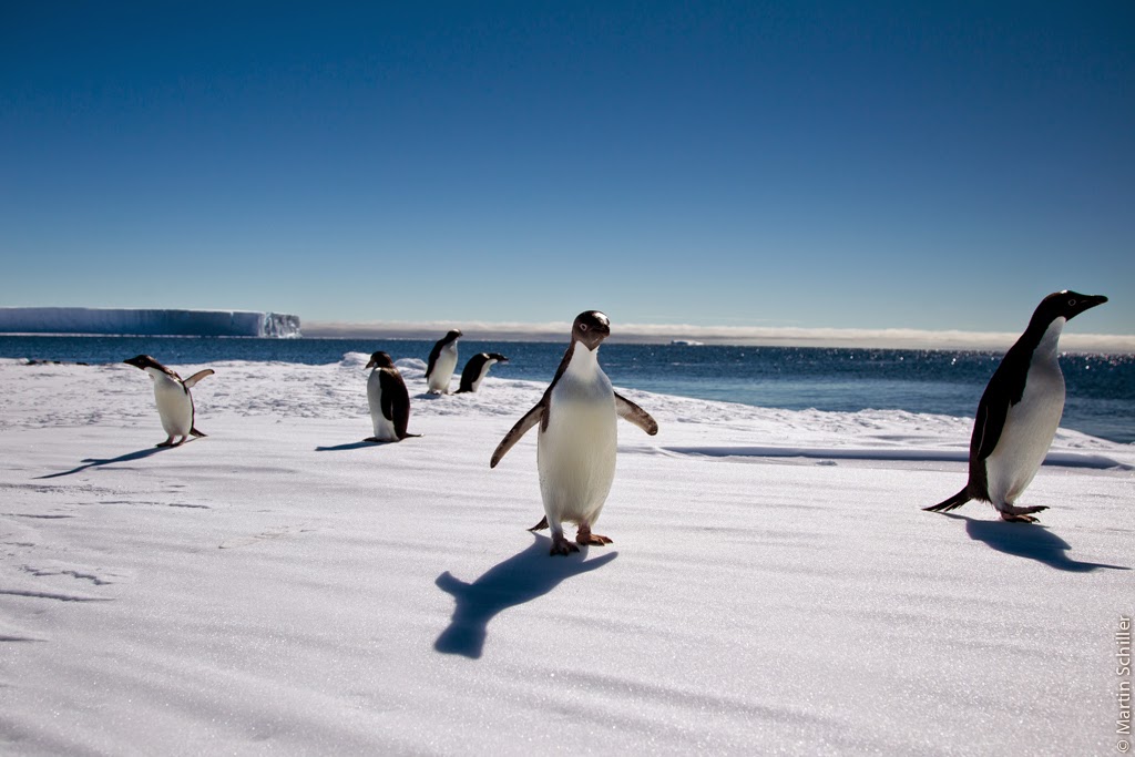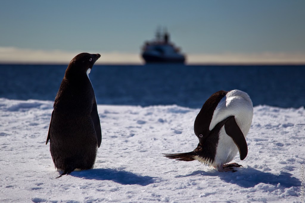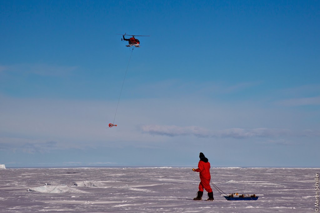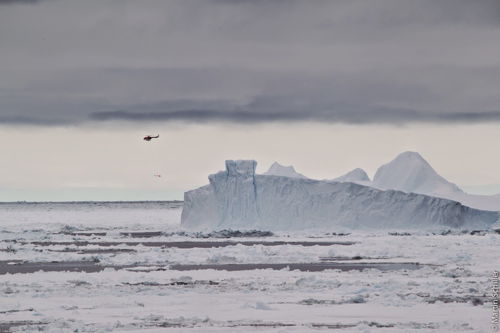 Man kann mit bloßem Auge die 20 Kilometer entfernte Neumayer III Station auf dem Schelfeis erkennen Da Polarstern auch ohne uns eisbrechen kann, lassen wir uns zu einer Eisstation absetzen. Polarstern holt uns dann nach 10 Stunden auf dem Eis wieder ab. Die kleinen Adelie Pinguine hab ich besonders ins Herz geschlossen. Die Tiere sind total neugierig. Wir Menschen sind bemüht den vom UBA (Umweltbundesamt) vorgeschriebenen Mindest-Abstand von 5 Metern einzuhalten. Doch irgendwie wissen die drolligen Kerle nichts von den Vorschriften des UBA, oder halten es nicht für nötig diese einzuhalten 🙂 Unser ROV (ferngesteuerter Tauchroboter) kurz vor dem Auftauchen. Sandra misst im Helikopter mit dem EM-Bird die Eisdicke. Parallel dazu misst Thomas mit dem GEM in der Pulka ebenfalls die Eisdicke. Zusätzlich wird ein Loch am Schnittpunkt gebohrt und die Eisdicke mit einem Maßband gemessen. Durch solch einen Vergleich kann man sehr gut die Messgenauigkeit der einzelnen Systeme bestimmen.