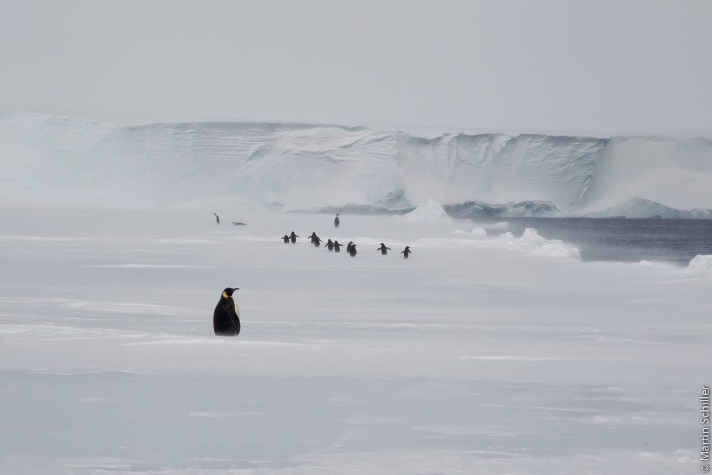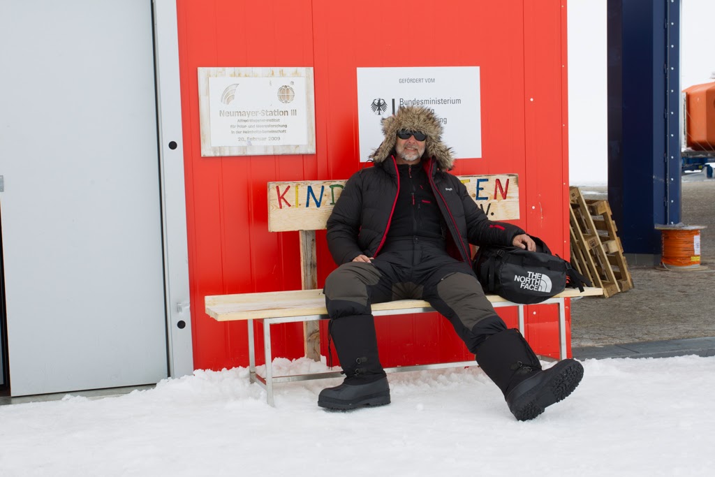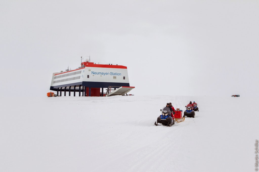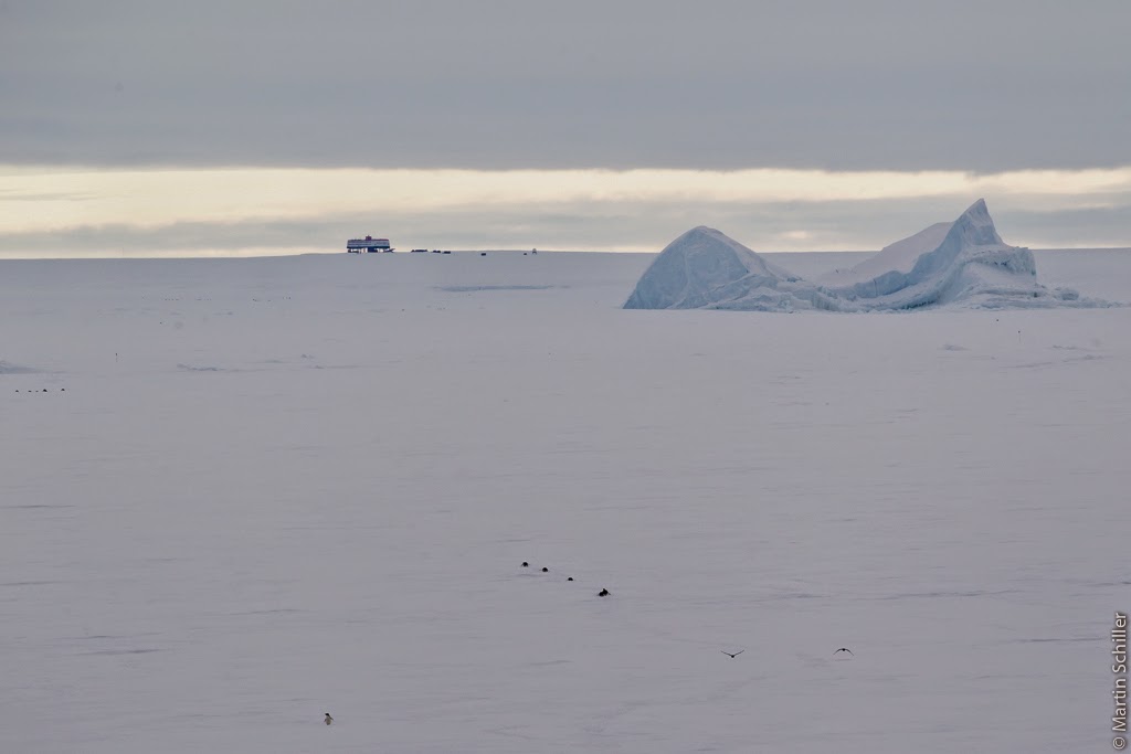Kaiserpinguine sind wesentlich größer als die Adeliepinguine Als klar war, dass wir nicht an den Nordanleger kommen fällt die Entscheidung zur Meereisentladung. Eine Entladung auf dem Meereis ist sehr zeitintensiv. Es müssen bei jeder Fuhre 20 Kilometer zur Neumayer III Station inklusive Schelfeiskante überwunden werden und dann nochmals das Gleiche zurück. Die Neumayer III Station ist die ständig besetzte Forschungsstation der Bundesrepublik Deutschland in der Antarktis. Wenn man sich ihr nähert hat das etwas sehr Surreales. Irgend wie stellt sich eine Art Raumschiff Enterprise Feeling ein. Am Eingang der Station. Foto: Thomas Hollands Raumschiff oder Polarstation? So eine Fahrt zur Neumayer bietet manche Überraschung. Vor allem wenn man hinter einem Pistenbully fährt. Das fordert Mensch und Material 🙂 Die Schelfeiskante